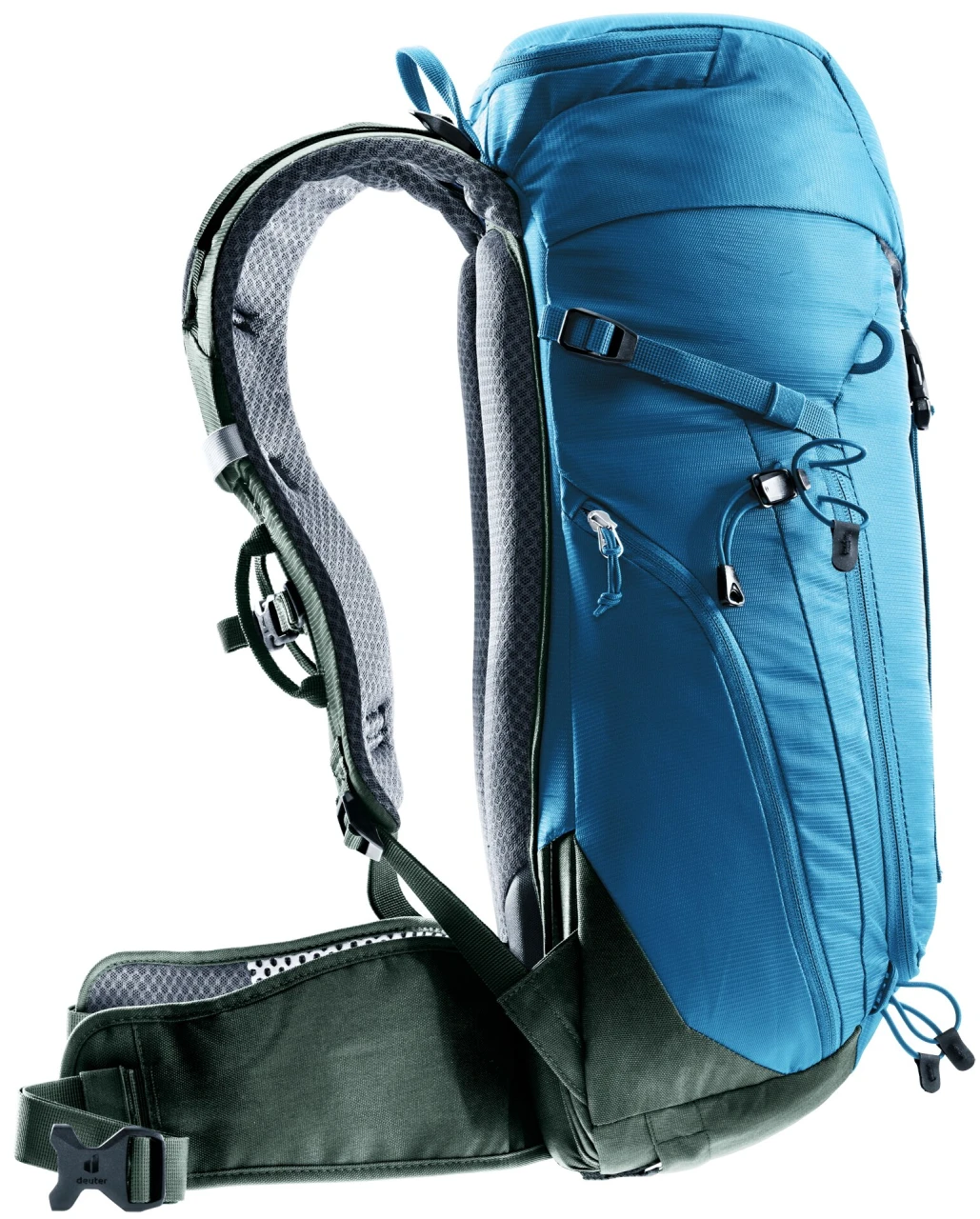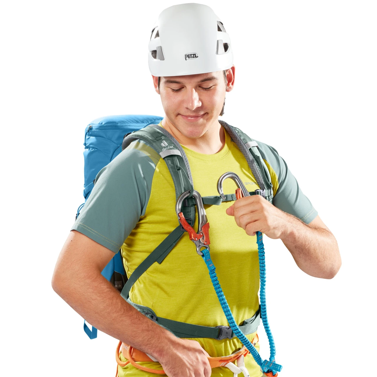 Das Airstripes Rückensystem mit geringer Rückenauflage und großen Belüftungskanälen sowie die perforierten Schulterträger und Hüftflossen sorgen für optimale Luftzirkulation, eine körpernahe Gewichtsverteilung und damit einen kompakten Sitz in jedem Terrain. Die flache Deckelkonstruktion bietet gute Kopffreiheit – auch mit Helm. Dank Fixierungen an den Schulterträgern sind die Karabiner des Klettersteigsets stets griffbereit. Zudem sind Ausrüstungsgegenstände und Material dank großem Reißverschluss-Frontzugang und Seitentaschen schnell zur Hand.