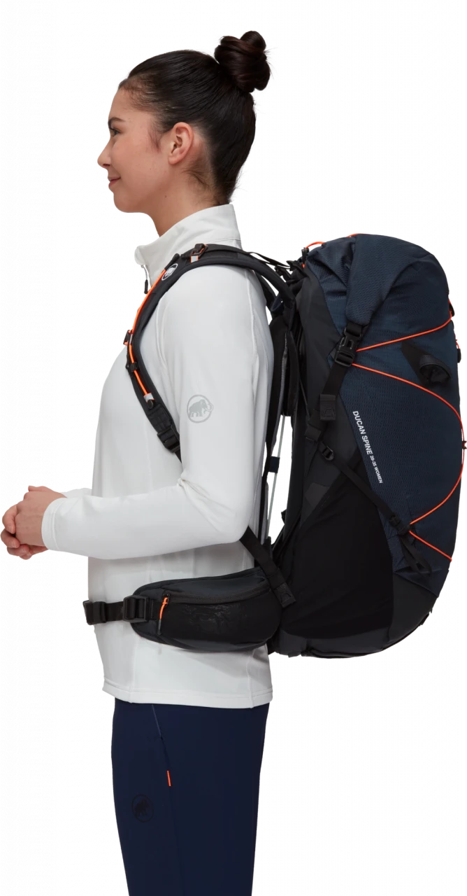 Ducan Spine 28-35 Women – die Kombination aus Active Spine Technology™, Leichtgewicht und Women Fit. Weniger Ermüdung dank gleichmässiger Gewichtsübertragung, mehr Tragekomfort durch Netzrücken für gute Rückenbelüftung. Schulterträger, Tragesystem, Hüftgurt und Dimensionierung des Rückens sind an die weibliche Anatomie angepasst. Mehr Flexibilität bieten die beim Tragen zugänglichen Taschen sowie das variable Packvolumen.