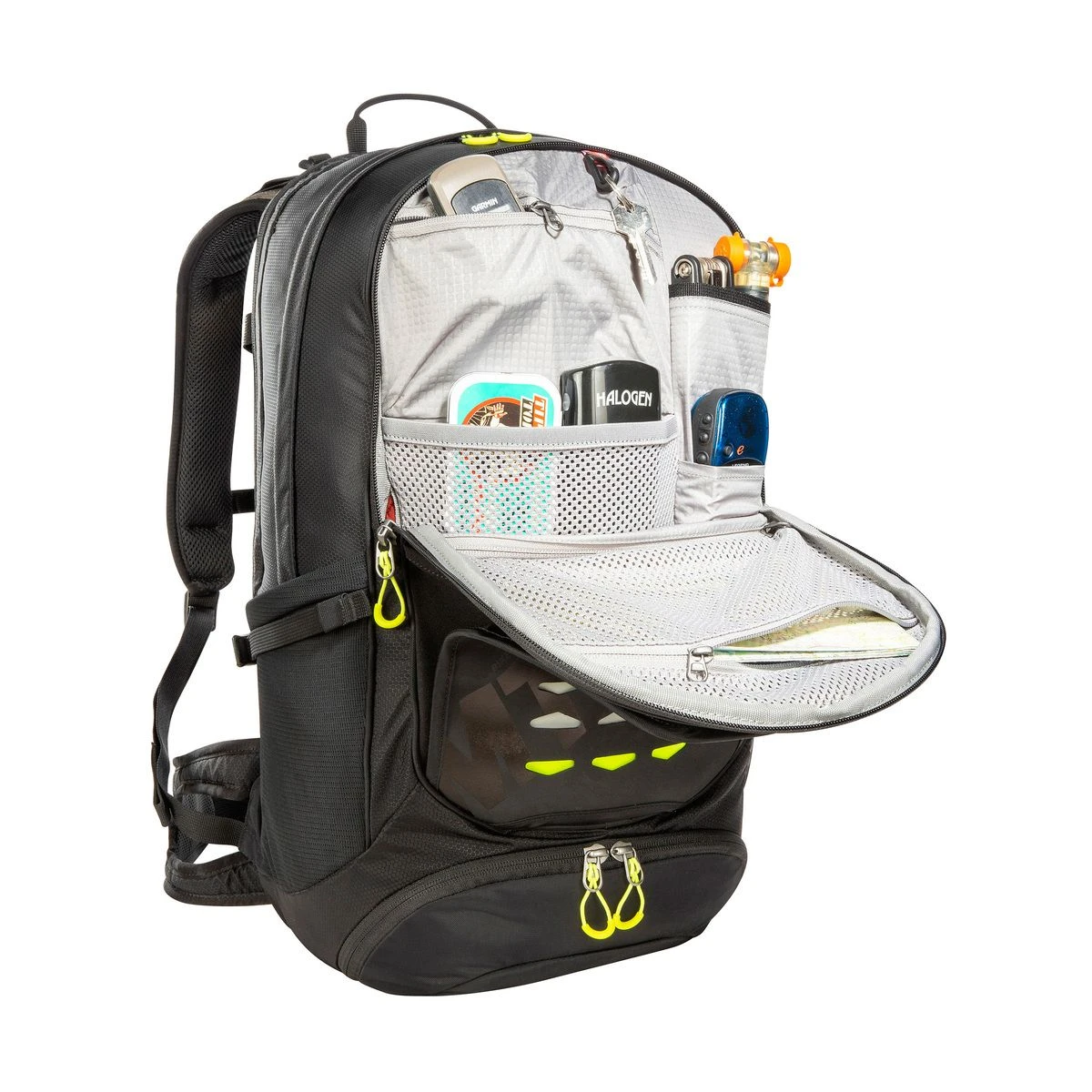 Der Bike Backpack MTB 28 bietet ein Volumen von 28 Litern im Hauptfach, Seitentaschen aus elastischem Material, ein Frontfach mit Einsteckfächern und Schlaufen für Werkzeug und eine Reißverschlusstasche auf einer Hüftflosse. Im Hauptfach befindet sich ein Extra-Fach für eine Trinkblase sowie ein Durchlass für den Trinkschlauch, im separat zugänglichen Bodenfach ist die Regenhülle verstaut.