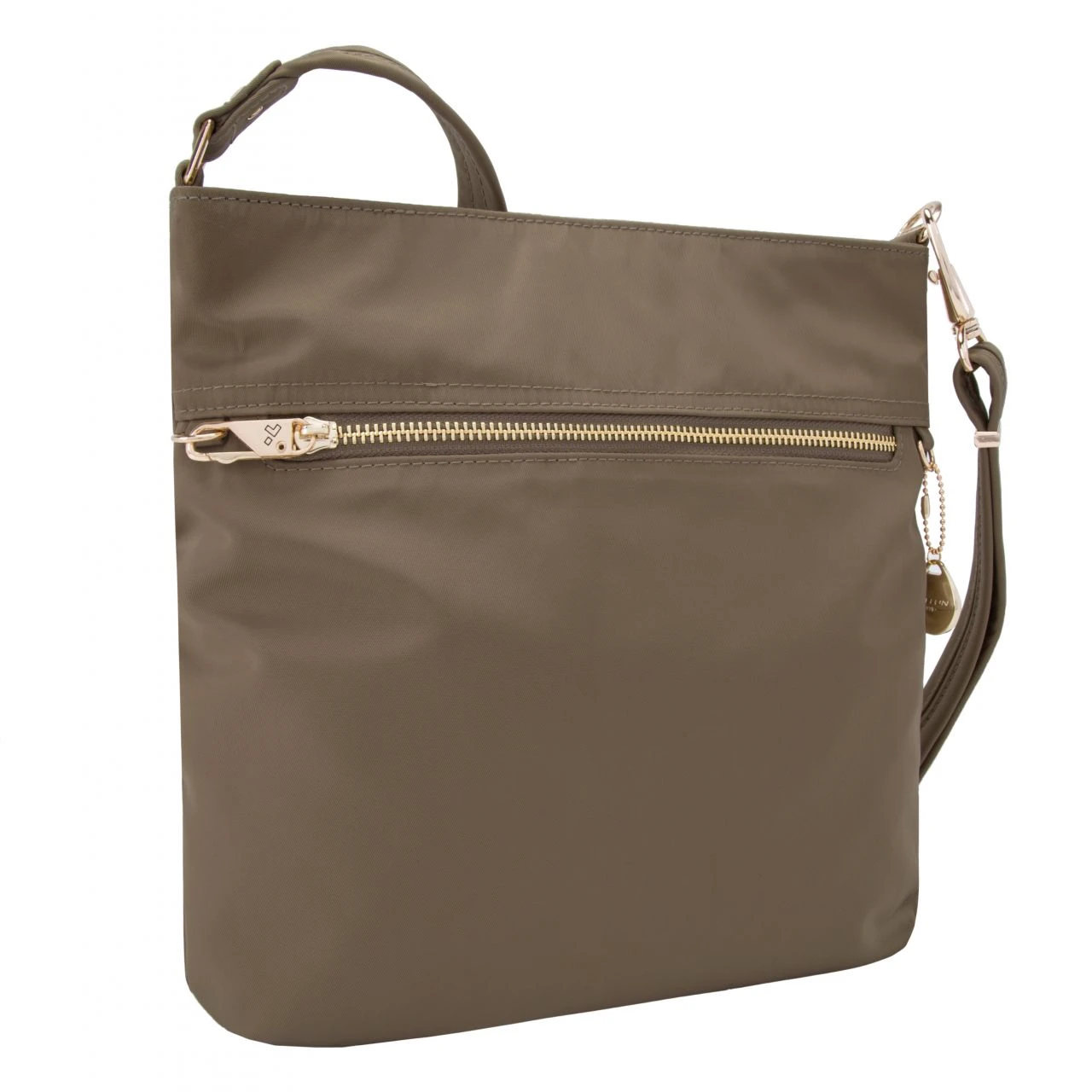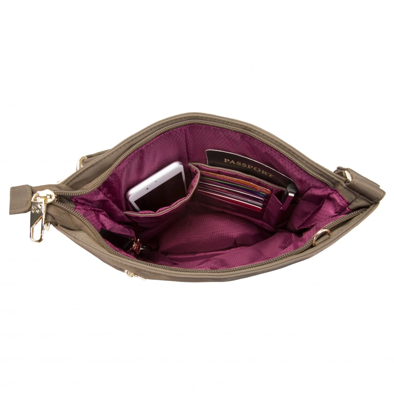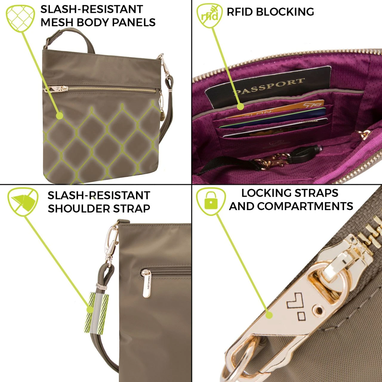 Patenierte Anti-Diebstahl-Tasche aus Edelstahlgewebe. Ausgestattet mit einem schnittfesten Umhängegurt und diebstahlsicherem Reißverschluss, um Ihre persönlichen Gegenstände zu schützen. Der Umhängegurt verbirgt Seile aus rostfreiem Stahl in sich, um das Zerschneiden zu verhindern. Die Taschenfächer sind mit verschließbaren Reißverschlüssen versehen. Des Weiteren besitzt das Hauptfach einen RFID-geschützten Steckplatz für Reisepass und Kreditkarten, damit Ihre Daten unterwegs nicht gestohlen werden können. Zusätzlich ist in der Seitentasche ein Schlüsselanhänger mit LED integriert.