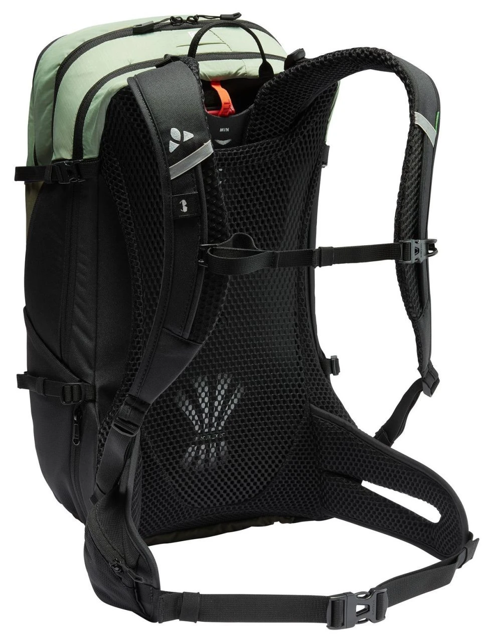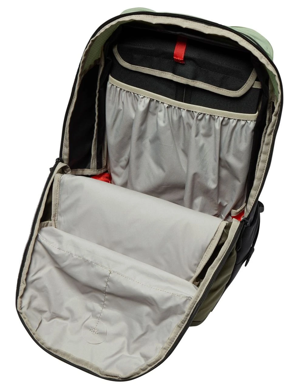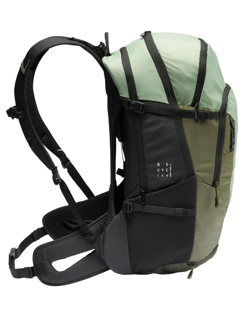 Material: Hauptstoff – Außenseite: 100% Polyamid (davon 52% recycelt); Beschichtung: 100% Polyurethan; 200D / PU coating / ripstop; Second fabric – Material: 100% Polyester (recycelt); Beschichtung: 100% Polyurethan; 600D / PU coated / plain weave; Futter: 100% Polyester (recycelt); 200 D Polyurethane coated; Regenhülle: 100% Polyamid; 190 T Polyurethane coated.