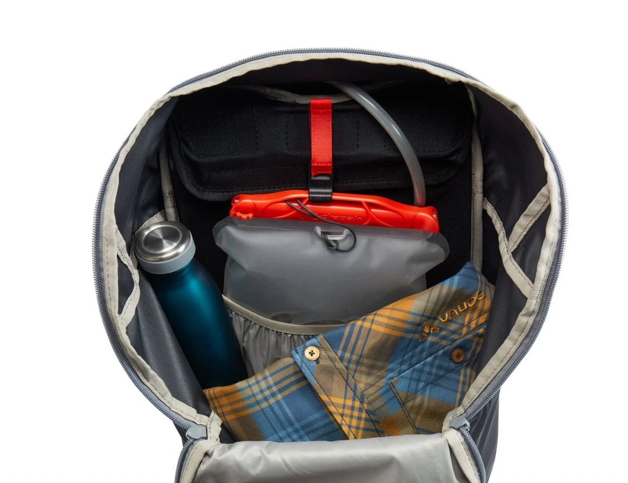 Material: Hauptstoff: 100% Polyamid; 210 D HT Maxi Ripstop Polyurethane coated; Second fabric – Außenseite: 100% Polyester (davon 50% recycelt); ; Beschichtung: 100% Polyurethan; 600 D Polyurethane coated 50% recycled; Futter: 100% Polyamid; 200 D Polyurethane coated; Regenhülle: 100% Polyamid; 190 T Polyurethane coated.